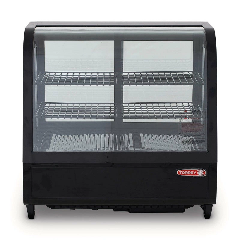 Vitrina de exhibición refrigerada con cristal panorámico ideal para una cafetería que vende sándwiches y otros snacks fríos.