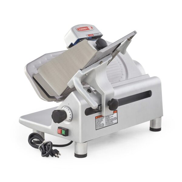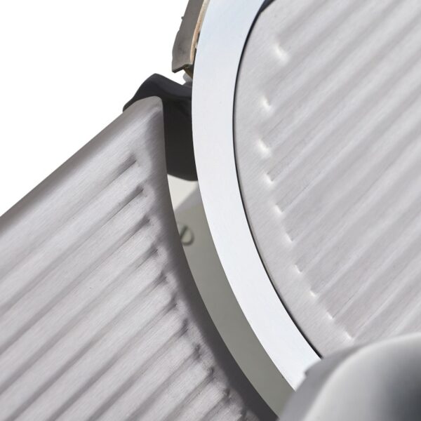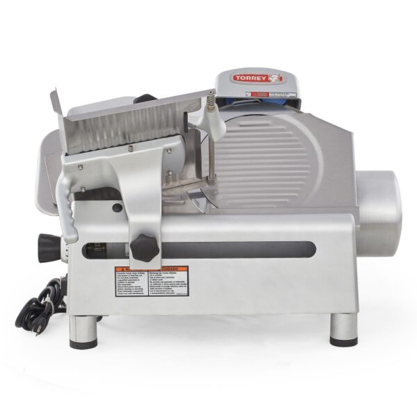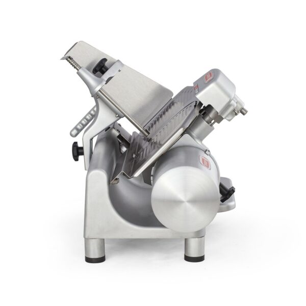 Rebanadora con transmisión de engranes, ideal para cortar carnes rojas sin hueso, construida en aluminio anodizado y acero inoxidable con cuchilla de 300 mm.